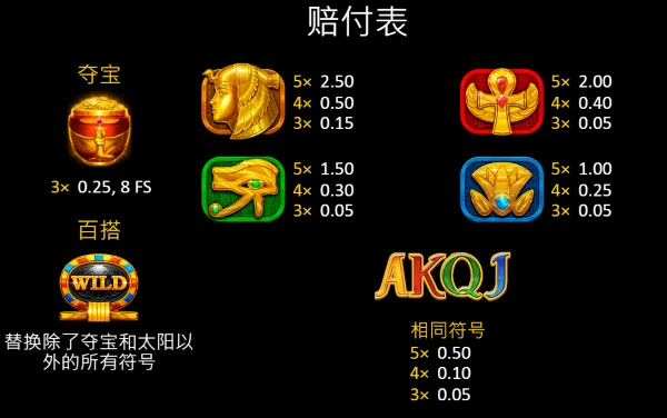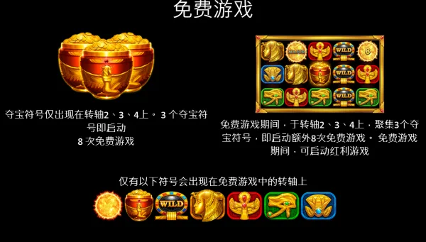遊戲以奪寶符號與太陽符號作為主要獎勵來源。奪寶符號出現在第二至第四輪,只要集滿三個即可啟動8次免費遊戲,期間仍能再觸發額外8次,讓免費回合具延展性,免費遊戲僅保留高額符號,盤面的組合集中度提高,連線獲利機會也隨之增加。
