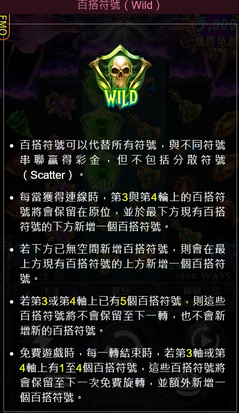 大法師的核心機制,圍繞在符文符號與紅利觸發設計上,Wild符號在盤面中扮演輔助角色,可替代多數一般符號,協助完成高價值連線,但仍保留對Scatter的限制,以維持紅利進場的門檻。