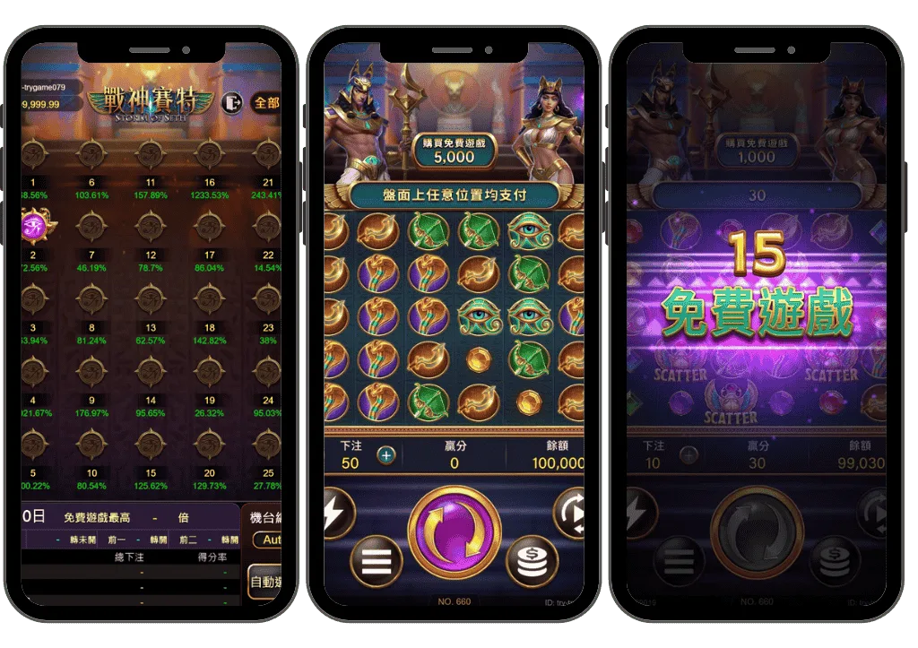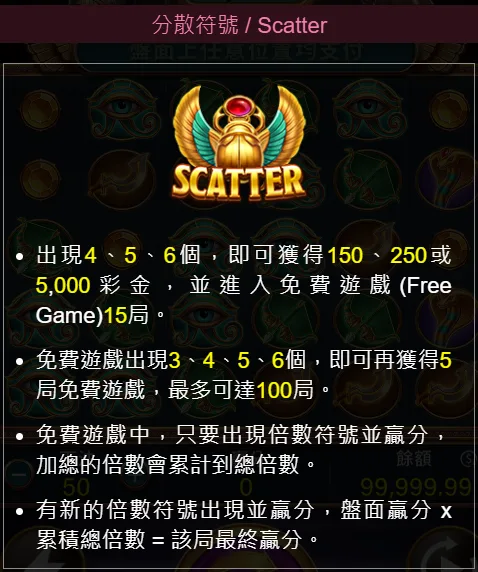 戰神賽特的核心機制圍繞在Scatter、免費遊戲與倍數累積,遊戲中的Scatter不需連線,只要在同一畫面累積到一定數量即可觸發免費遊戲,進入後會給固定次數的免費旋轉,並有機會在過程中再次出現Scatter來延長局數。是否能在免費遊戲中拉長回合數,是影響整體回報高低的關鍵。
